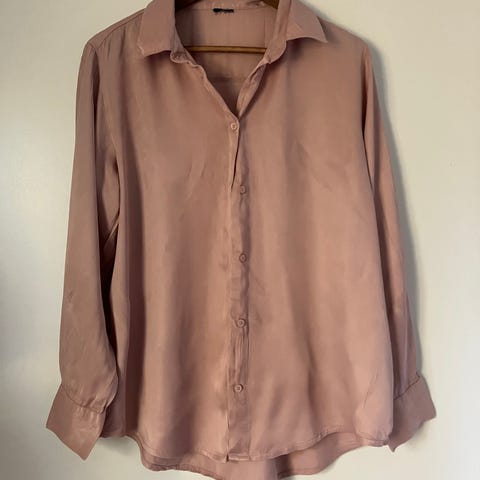 Uudenveroinen Kaija S -merkkinen ruskeansävyinen paita, koko 44. Hieman läpikuultavaa kangasta, jossa samettinen pintakuviointi. Kainalo-kainalomitta n. 60 cm, olka-helma n. 68 cm. Suora malli, helman leveys 62 cm. Materiaali 100 % polyesteri.
