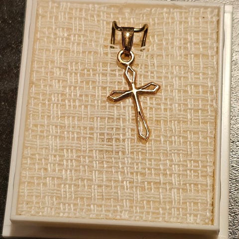 Myydään upea kultainen risti helmikoristein. Korkeus 4cm lenkin kanssa, leveys 2cm.Hinta 170e+postikulut.