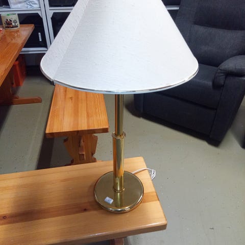 Kaunis valkea pöytävalaisin, jalusta ja varsi hopeanväristä metallia. Korkeus 39,5 cm. Valkea kankainen varjostinosa korkeus 11,5 cm, leveys alhaalla 14 cm ja yläreunassa 10,5 cm. Scan Lamps, nro 16049. Max 40W. Johto 2 m. Ehjä ja siisti. Postitus tai nouto.