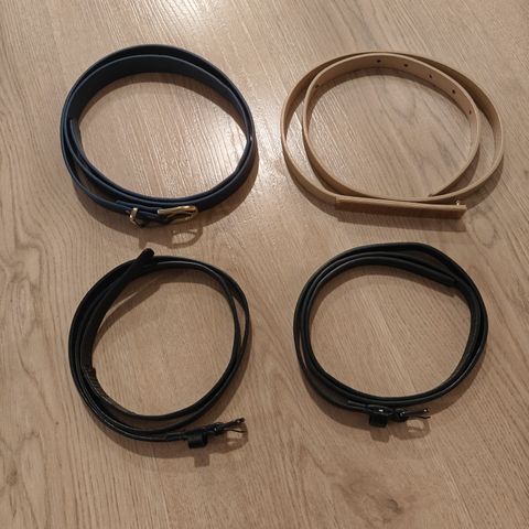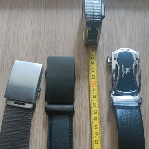 Hyväkuntoisia vöitä. Koot ylin 106 cm pitkä ja 2.8 cm leveä. Keskimmäinen 126cm pitkä ja 2.7 cm leveä ja alin 125 cm ja 2.8 cm leveä. Hinta 1 euro/ kpl tai 2 eurolla kaikki 3 kpl.