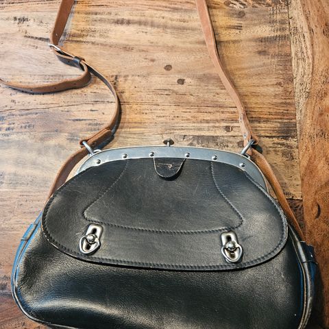 Nahkainen rahastajan laukku.Taskun toinen lukitus puutteellinen.Postikulut sisältyy hintaan.