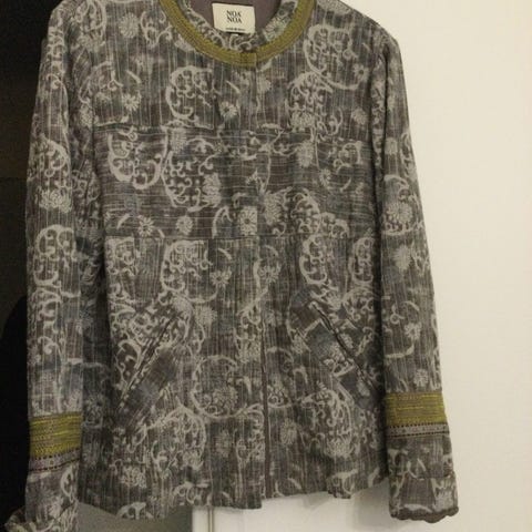 Myytävänä hyväkuntoinen Nina Buzo jakku, koko 34. Pituus olkapäästä helmaan 57cm, hihan pituus 60cm, vyötärökohdassa leveys 39,5 cm.