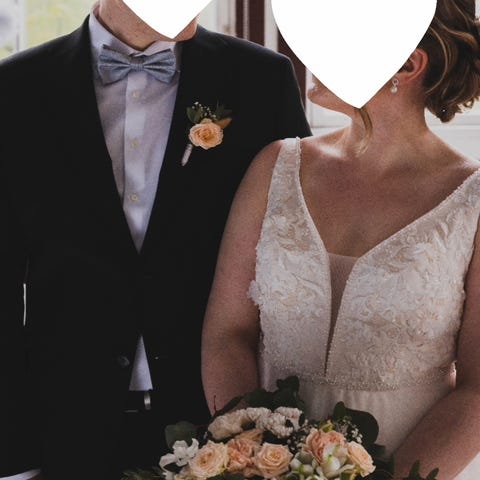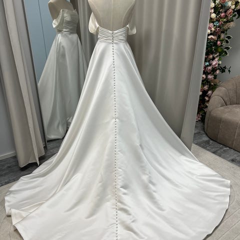 Ollut käytössä omissa häissä syksyllä 2023, pesetetty pesulassa tämän jälkeen. Pukuun on tehty muokkauksia sopimaan noin 160cm mittaiselle. Vyötärön kapein kohta on 72cm ympärysmitaltaan ja pituus olkaimesta helmaan on 142cm.