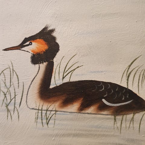 Silkkikankaalle maalattu punatulkkutaulu. Korkeus 15 cm ja leveys 11.5 cm. Ripustin.