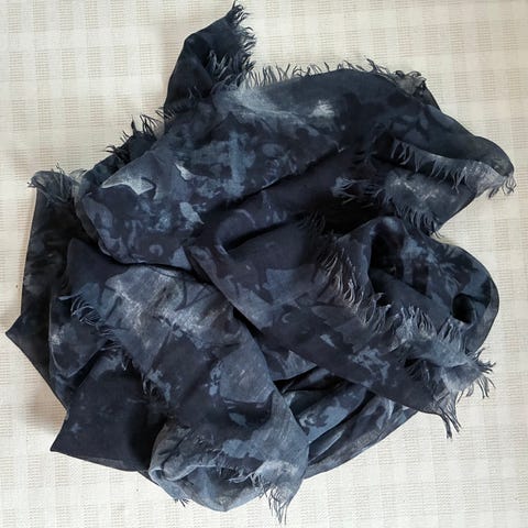 Pitkulainen kukkahuivi, mustalla pohjalla punaisia ja valkoisia kukkia.