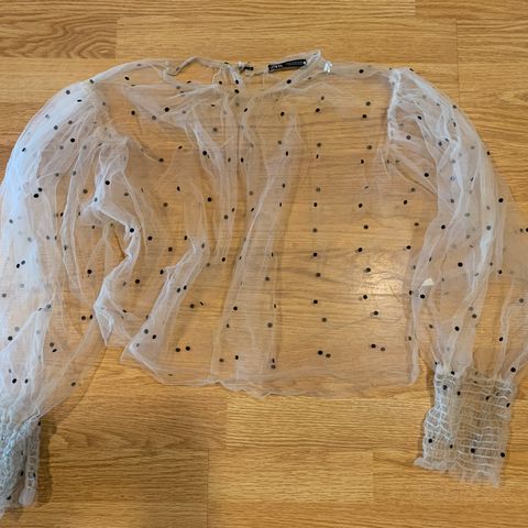 Kaunis Zaran kaksikerros pusero, päältä musta ja valkoinen aluskerros osittain näkyvä, lyhyet hihat ja valetasku,jossa strassikoru irrotettavissa. Pituus n.67 ja kainalo-kainalo n 40cm.