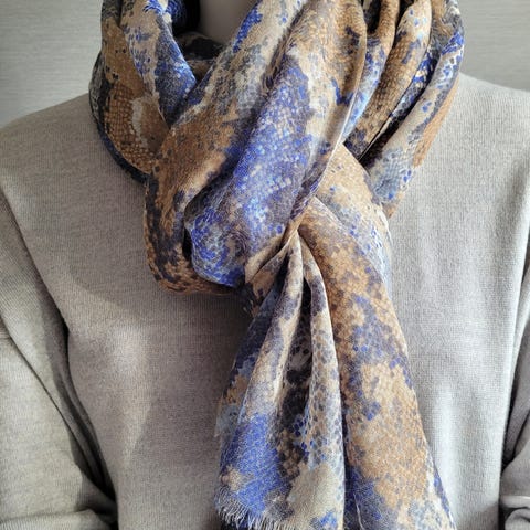 Huivin väreissä on harmaan eri sävyjä ja hieman vanhan roosan vivahdusta. Sopii hyvin moniin muihin väreihin, mutta erityisesti pastellisävyihin, joihin tuo hieman särmää. Materiaali on henkäyksenkeveää silkkipuuvillaa, todella pehmeää ihoaa vasten. Suuri koko, 120 cm x 120 cm, mahdollistaa erilaiset kiedontatavat. Kerran, pari olen käyttänyt, mutta kunto on kuin uudessa.
