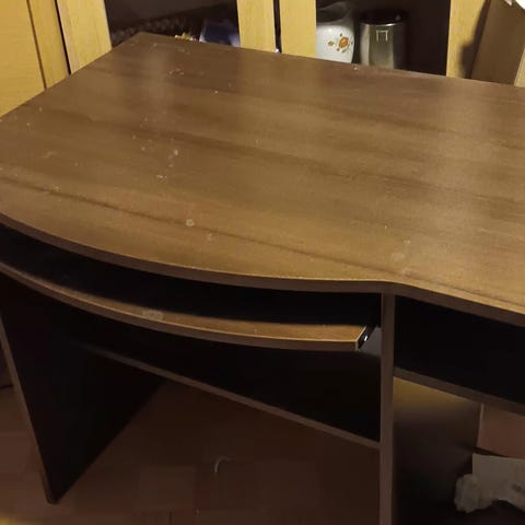 Puusepällä teetetty vuosituhannen vaihteessa. Mäntypuuta. Pinta petsilakattu / maalattu öljymaalilla. Näyttötasossa säädettävä korkeus. Ulosvedettävä näppäintaso liukukiskoin. Vetolaatikosto liukukiskoin pyörillä. Tietokonehylly pyörillä. Sivutuet irroitettavat. Pöytätaso tappiliitoksin irroitettavissa. Myydään tilanpuutteen vuoksi. Lisätietoja kysymällä.