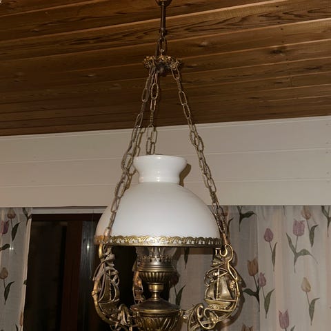Kaunis vanha valaisin, yhdellä polttimolla, Ehjä lasikupu. Ketjun pituus 60cm. Katsothan muutkin ilmoitukseni.