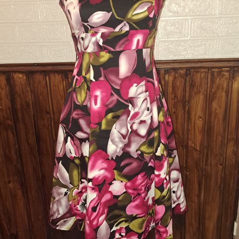 Vaaleanruskea-punainen-valkoinen kukkamekko, juhlamekko XS