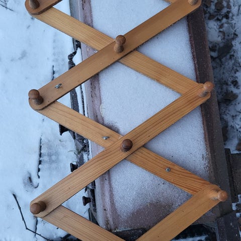 Myydään retro naulakko. Valkoinen naulakko on jykevä ja painavahko, ja se pysyy tämän vuoksi paremmin pystyssä kuin heppoisammat pystynaulakot. Naulakko menee kolmeen osaan, joten se on näin helpompi kuljettaa näin kuin kokonaisena. Jonkin verran ajan patinaa, mutta se kuuluu asiaan. Nouto Arabianrannasta.