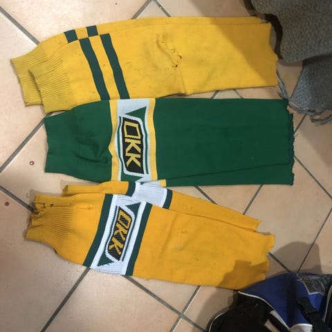 Myyn kuvan jääkiekkovarusteet. Harkkapaidat 5e kappale, kakdi kevytuntuvatakkia ja yksi trikootakki 10e kappale, kolmet sukat 5 e kappale ja viisi lippistä 5e kappale. Koko satsi yhteensä 55e. Mielestäni hhväkuntoiset mutta sukissa ja lippiksissä näkyy käytön jälkiä. Voin tuoda jos niin sovitaan