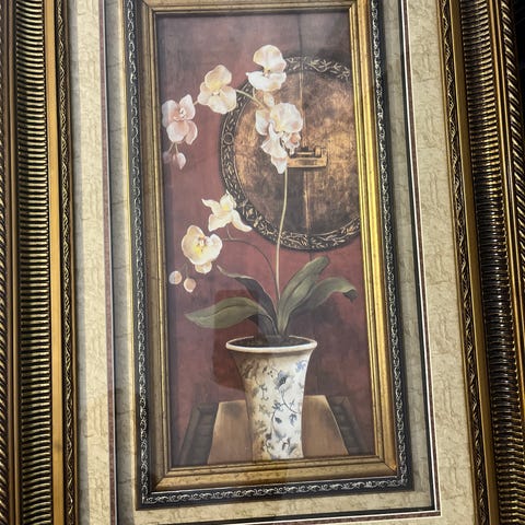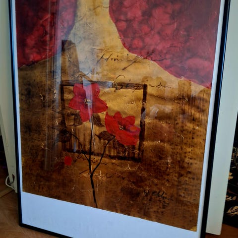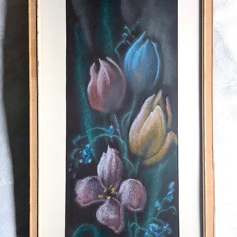 Myydään kaunis kukka-asetelmataulu. Teoksen koko kehyksineen 41x26 cm, kehysten leveys 5 cm. Sekatyyli: vesi- ja öljyväri. Taiteilijaksi on arvioitu suomalainen Ester Helenius, signeeraus E.H. Varmistusta asialle ei ole saatu.