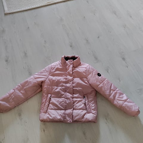 Myydään harmaa, kuviollinen kevyttoppatakki. Irrotettavassa hupussa on irrotettava karvareunus.