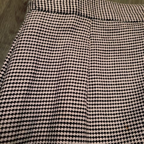 Vyötärön ympärys 68cm ja lantion ympärys 96cm sekä pituus 73cm. Ohut kukonaskel ruudutus punaruskeamustalla yhdistelmällä. Asetaatti vuorella.