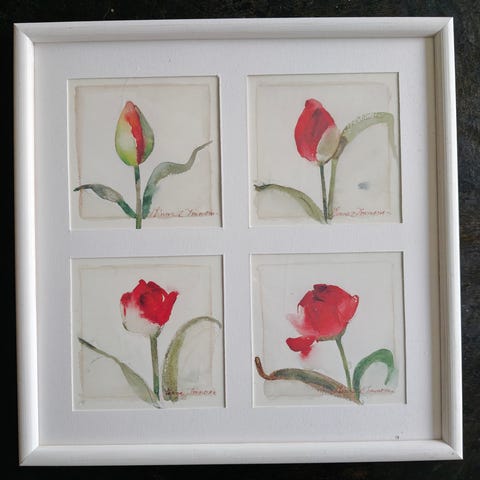 Minna Immosen akvarellityö Juhannusruusut vuodelta 1995. Työn korkeus on 49 cm ja leveys 35 cm. Kehys 71 X 51 cm.