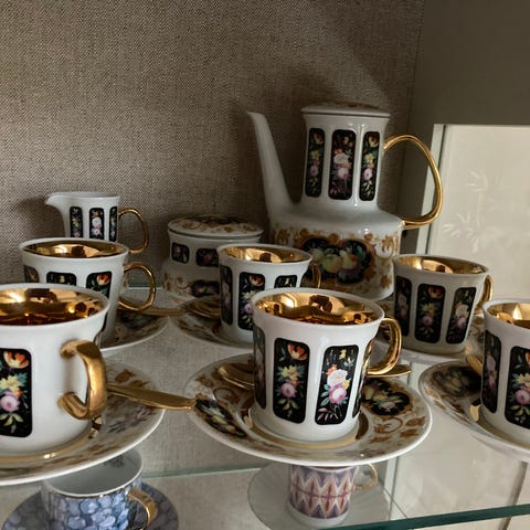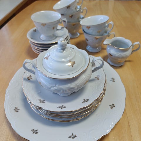 Kuvanmukainen upea kahviastiasto. Virheetön kunto. Sis. 6 kuppiparia ja asetit, kermakko, sokerikko sekä tarjoiluvati.