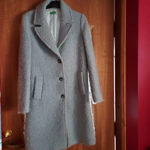 Ajaton. Pitkä beigevärinen villakangas takki.