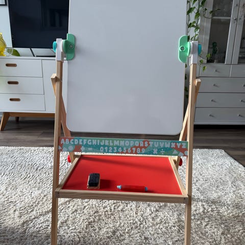 Kevytrakenteinen pöytäteline, jonka yhdellä puolella on valkotaulu ja toisella liitutaulu. Sivuilla olevista säätöruuveista telineen puolta voi vaihtaa. Mukana liituja sekä pyyhittäviä tusseja (käytettyjä). Hyvässä kunnossa, ehjä.