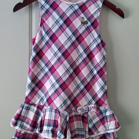 Gymboreen mekko kevään ja kesän juhliin. Koko on lasten 8 (USA). Myös samaa kangasta oleva rusetti hiuksiin kuuluu mukaan.