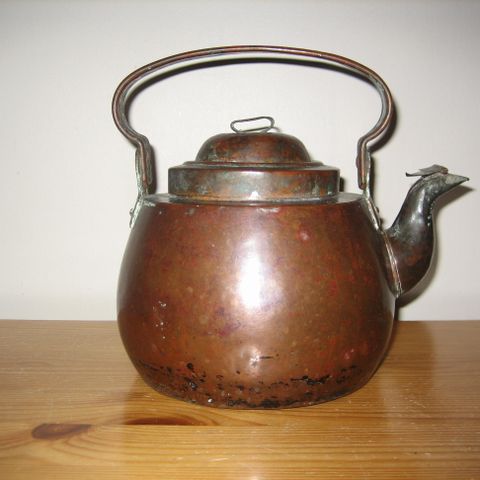 Vanha, hyvin patinoitunut kuparipannu, halkaisija 17 cm nokan kanssa. Kolhuja mutta sympaattinen.