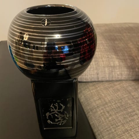 Design Jussi Riihimäki. Valmistaja Jussis Glas. Korkeus 21,5cm halkaisija 11cm. Lyijykristallia. Suomalaista käsityötä.