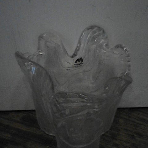 Muurlan lasi maljakko kirkas. Korkeus 21cm halkaisija 15cm.
