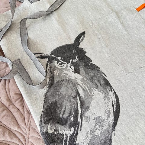 Uusi keltavalkoinen esiliina, pituus 88 cm ja leveys 81 cm. 100 puuvillaa. OVH 49.