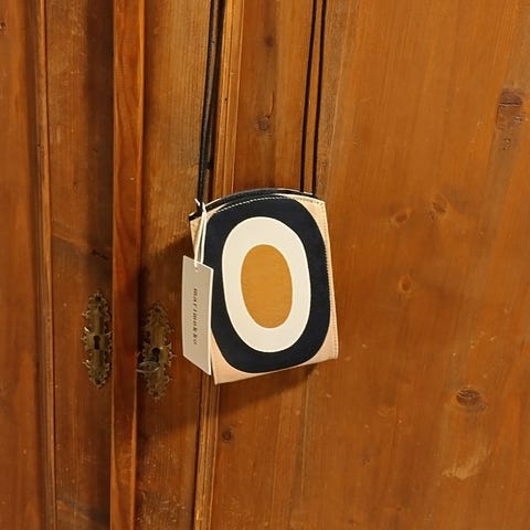 Uusi (laput kiinni) Marimekon laukku. Tähän mahtuu kätevästi reilun kokoinen kännykkä ja maksukortit. Tukevaa, vuorattua, kovaa puuvillakangasta. Reunat nahkaa sekä melko pitkät hihnat myös nahkaa.