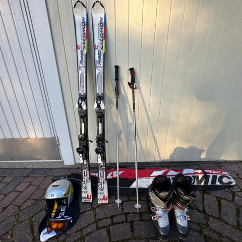 Miesten laskettelupaketti; Salomon sukset 196 cm siteineen ja sauvoineen, Salomonin monot kokoa 43-44 ja tilava suksipussi.