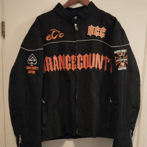 Käyttämätön takki, vuosia varastossa ollut virallinen "Orange County Choppers" tuote. Tuttu TV-sarjasta. Löytyy kaikki suojat, irrotettava vuori ym. Koko sopiva noin 177cm normipainoiselle.