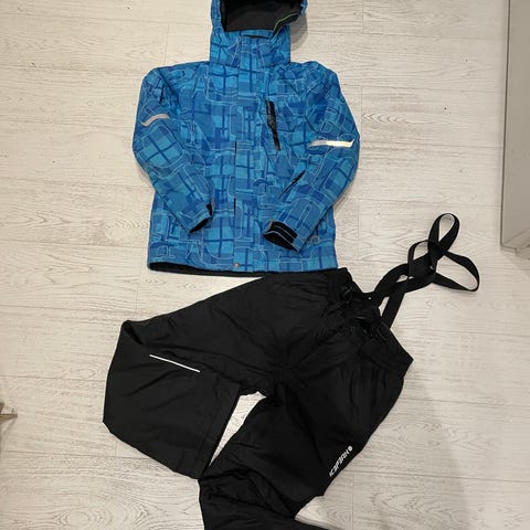 Hyvässä kunnossa oleva lasten Torstai-merkkinen lasketteluasu. Koko 140 cm. Toisessa housun lahkeessa vetoketju rikki, muuten ehjä.