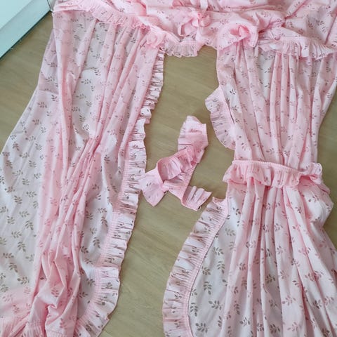 Kauniit valkoiset verhot reunapitsillä. Kuvassa taitettu neljään osaan, oikeasti kokoa 104cm x 73cm. Tuoksuton ja lemmikitön koti eli erinomaisessa kunnossa!