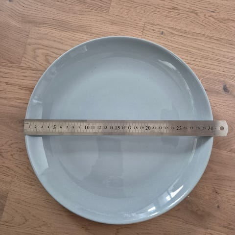 Halkaisija n. 24,5 cm, korkeus n. 9,3 cm. Väri valkoinen/ruskea/tummansininen.