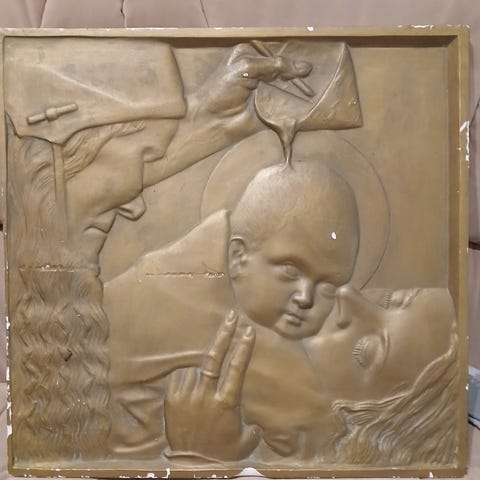Pronssinvärinen pyöreä seinäreliefi, kipsiä.