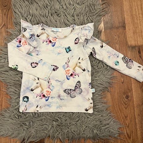 Kaunis ja erittäin siisti liila Pop&co olkafrilla college-paita, koko 98.
