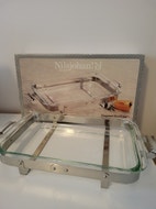Uuninkestävä lasivuoka 3 litraa tarjoilutelineellä.