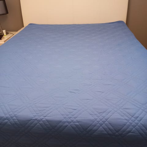 Yhden hengen sänkyyn sopiva. Vähäisessä käytössä ollut mökillä , kerran pesty. Paksua puuvillaa. Kymmenen senttiä leveät kaitaleet ympäriinsä. Peitteen koko on 160x 250 cm. Nouto Tesomalta sovitusti tai postitus jolloin postikulut ostajalle.