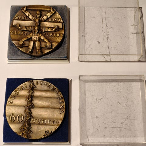 STK 75 v. Pronssiin valettu mitali. Toivo. J. Jaatinen. 300kpl numeroituna. V. 1982.Pro pace laboris Työrauhan puolesta. Puisessa säilytyslaatikossa.