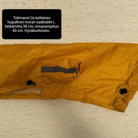 Janutex merkkinen kotimainen koiran sadetakki. Takin koko on 45 MK. Tämä on mitoitukseltaan mäyräkoiralle tehty sadetakki. Sopii hyvin jollekin laihalle ja pitkälle koiralle. Keltainen / pinkki liukuvärjätty sadetakki. Musta joustava kaulus. Heijastimet kiertää takin reunoilla ja selkäremmissä. Selkäremmissä on tukeva klipsu ja on reilusti säätövaraa. Hyväkuntoinen takki. Joitain kertoja käytetty syksyllä. Ihan ehjä takki. Made in Finland. Reunoilta on vähän pidempi kuin selästä. Takki menee hyvin takajalkojen päälle. Hyvin muotoiltu sadesään malli mikä on hyvä pitkälle ja laihalle koiralle.