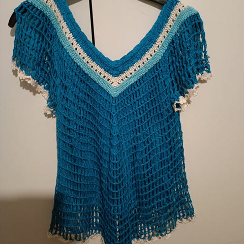 Musta Vero Modan verkkoneule. Koko M. Pehmeää ja pörröistä lankaa. Helmassa ja kaluksessa tyllikoristeet sekä pieniä tummia helmiä. Helmiä myös hihansuissa.