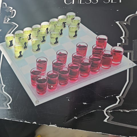 lasinen drinking chess merkkinen shotti shakkipeli,nappuloina lasiset shottilasit,hyväkuntoinen peli,alkuperäinen pakkauslaatikko,