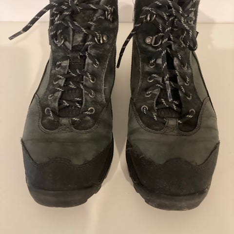 Nahkaiset nauhalliset talvikengät, primaloft 200gr ja vibram pohja, vedenkestävät. Kevyet ja siistit, toisessa edessä liimaus vähän irti, ja varsi säilytyksestä lytyssä.