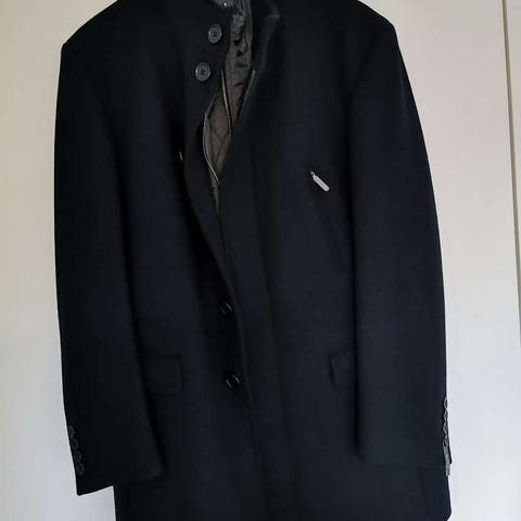 Miesten musta, vuorellinen, nuorekas Madison Avenue villakangas takki, koko 54.