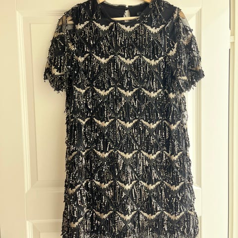 Ruskea mekko kimaltavaa kangasta cut-out yksityskohdalla ja kiristettävällä narulla, jolla saa mekkoa lyhennettyä. Koko XXS. Ei käytetty, laput yhä kiinni. Joustavaa kangasta.
