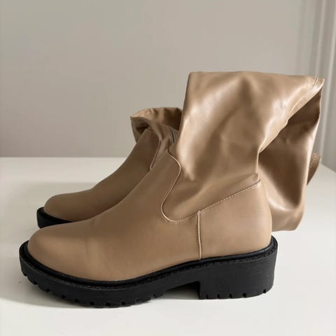 Tyylikkäät ruskeat paksukorkoiset saappaat lyhyellä varrella. Koko 40, mutta koko vastaa 38, koska ei mennyt omaan 39 jalkaan. Käyttämättömät.