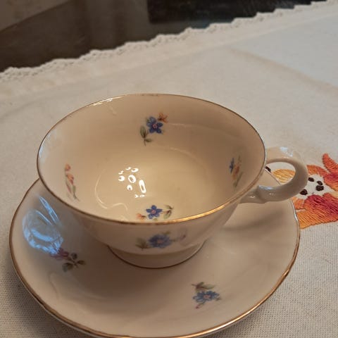 Kuvien mukaiset. Alunperin eivät ole olleet pari. Kupissa on muutamia krakelointiviivoja, mutta ei lohkeamia. Lautanen on ok kunnossa.