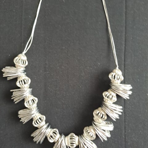 Uusi hopean värinen koristeellinen kaulakoru naisen kuvalla. Pitkä.