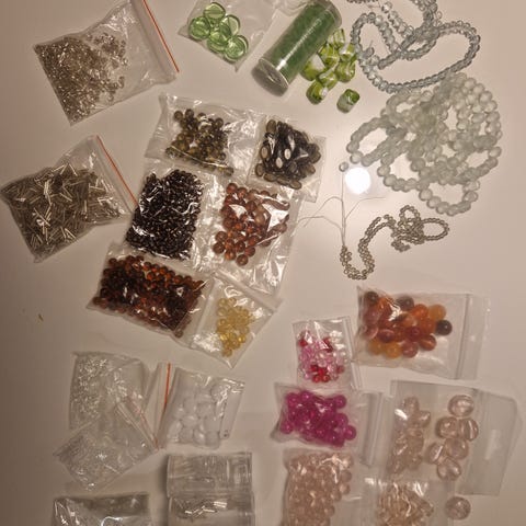 Kirurginteräs, puuvillalanka ja lasihelmi.