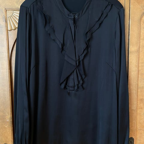 Pari kertaa käytetty Mosaic juhlapusero. Pyöreä pääntie ja musta röyhelö edessä. Helmassa ja hihansuissa kuminauha.